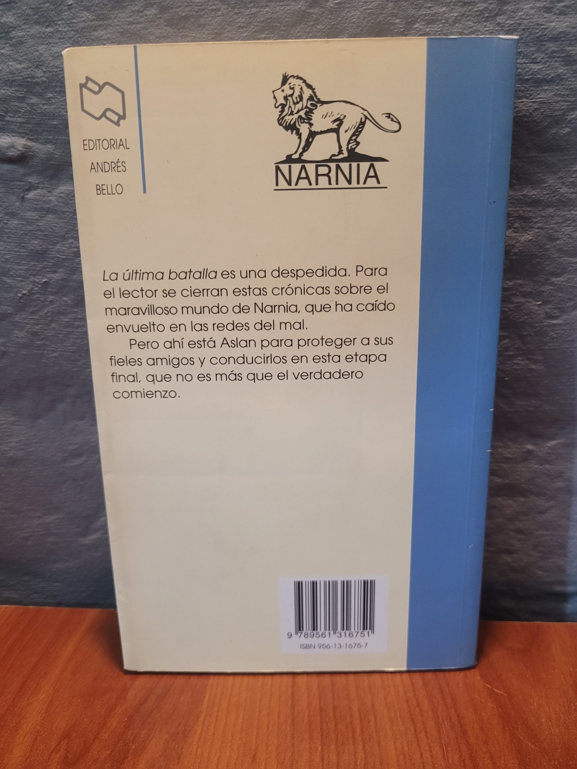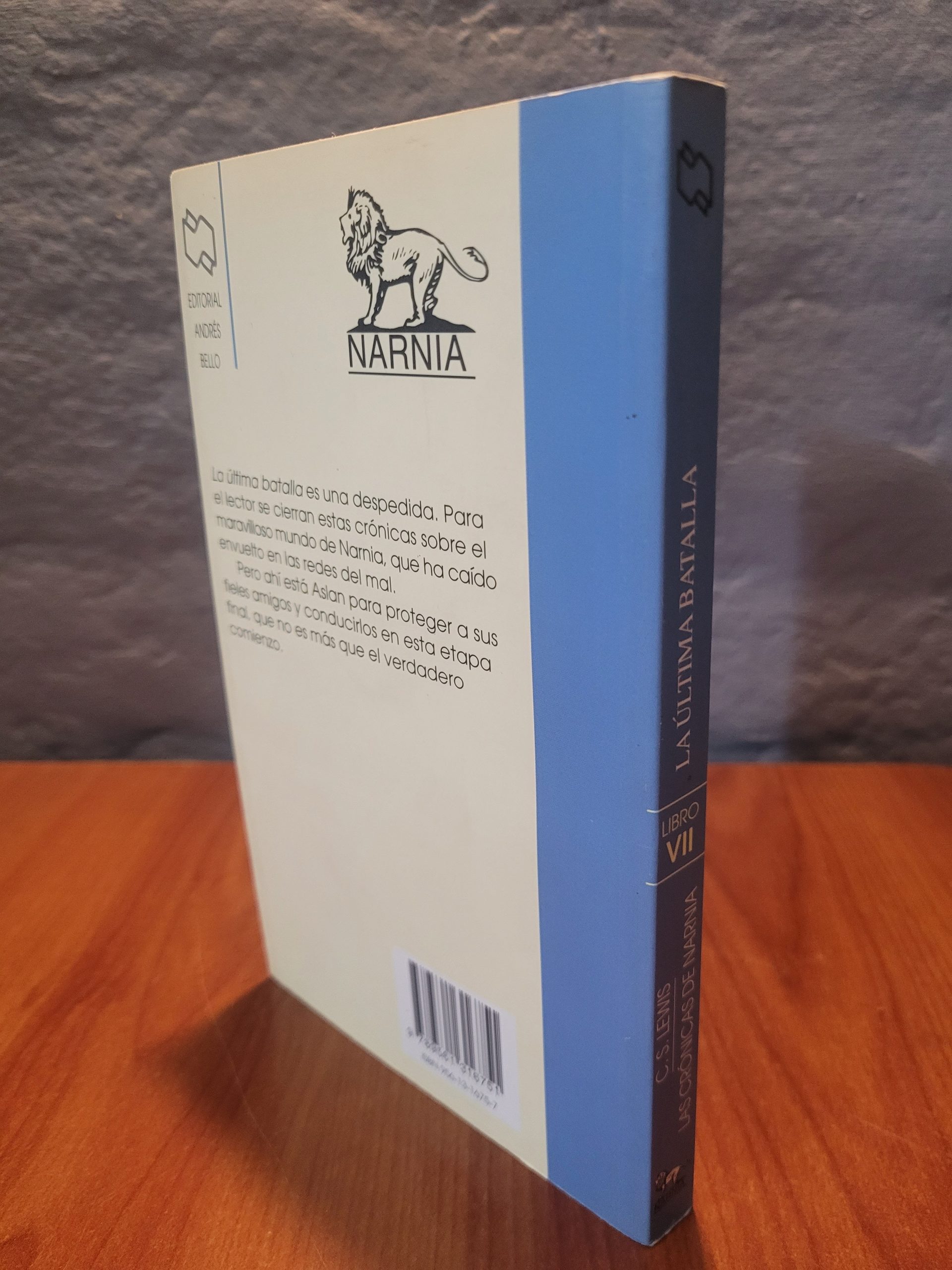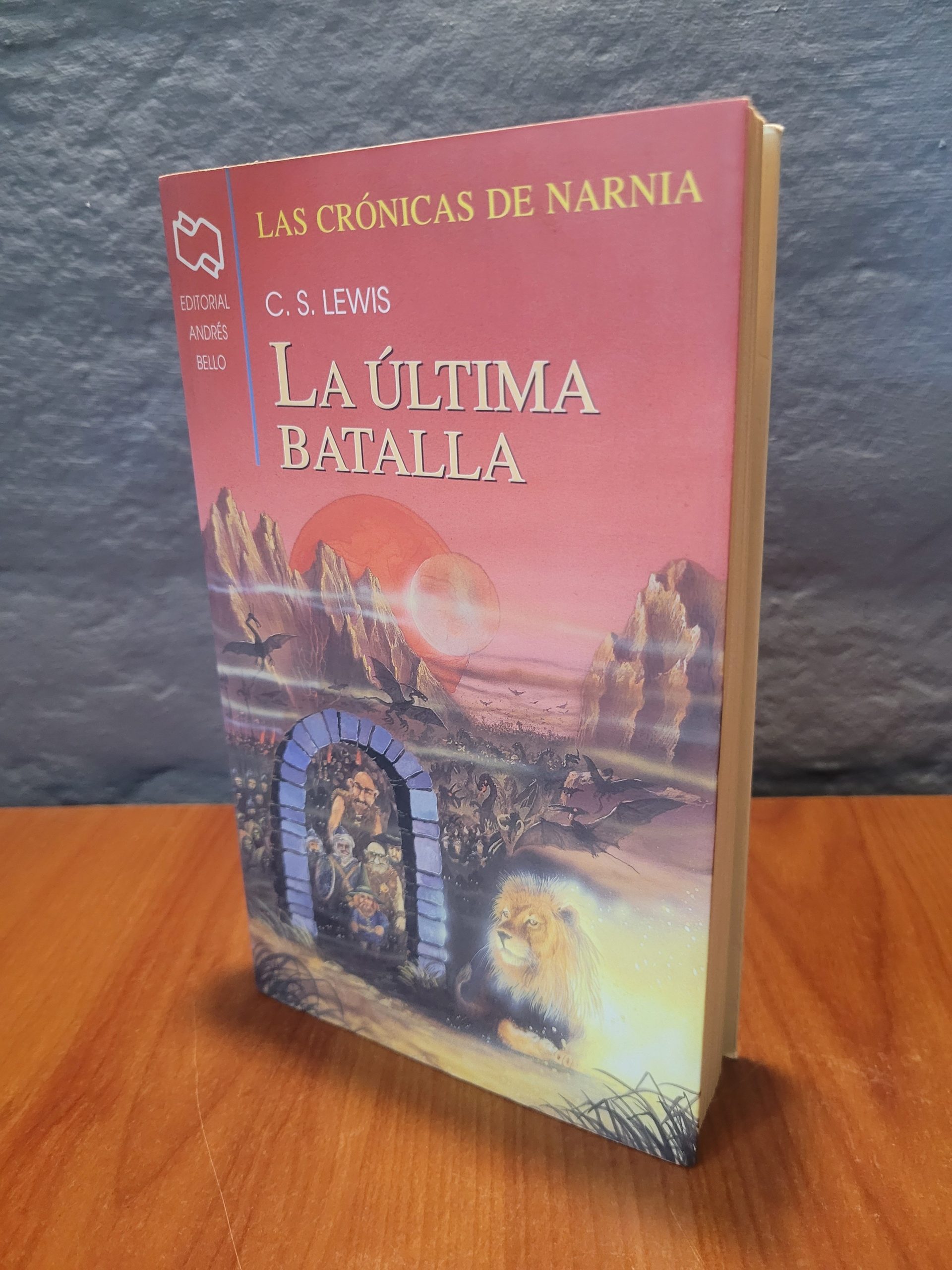 Esta edición de «La Última Batalla» pertenece a la prestigiosa Editorial Andrés Bello. Se trata del cierre épico de la mundialmente famosa saga de C. S. Lewis. La portada presenta una ilustración clásica que evoca el tono solemne y fantástico del final de Narnia, mostrando elementos icónicos como el portal, las criaturas mitológicas y la figura imponente de Aslan. Es un ejemplar imprescindible para completar la colección de una de las sagas más influyentes de la literatura universal